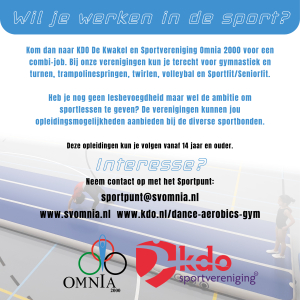 Werken in de sport? Dat is ontzettend leuk, goed voor je ontwikkeling en staat mooi op je CV. Neem contact op met Omnia voor de diverse mogelijkheden. Ook werken we eventueel samen met andere verenigingen om zo voor jou misschien een leuke combi-job te kunnen aanbieden.